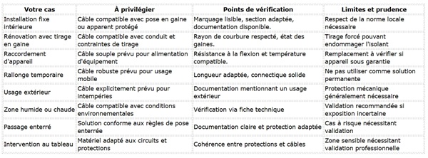 Ce tableau sert de repère pour relier la situation rencontrée à une famille de câbles adaptée. Il ne remplace pas les normes locales ni un diagnostic professionnel.