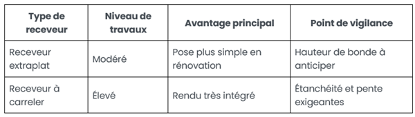 Le receveur extraplat est généralement la solution la plus simple en rénovation.